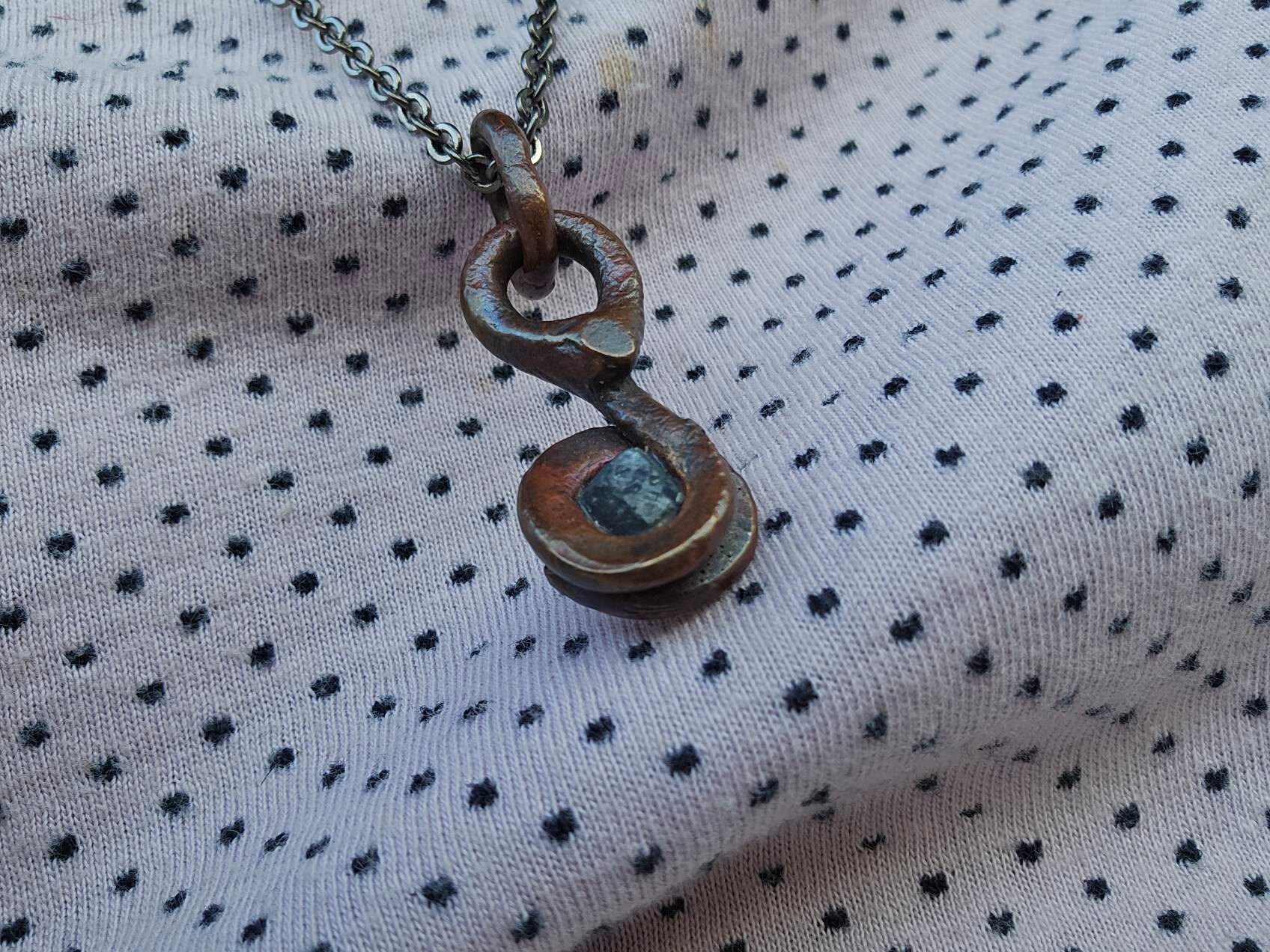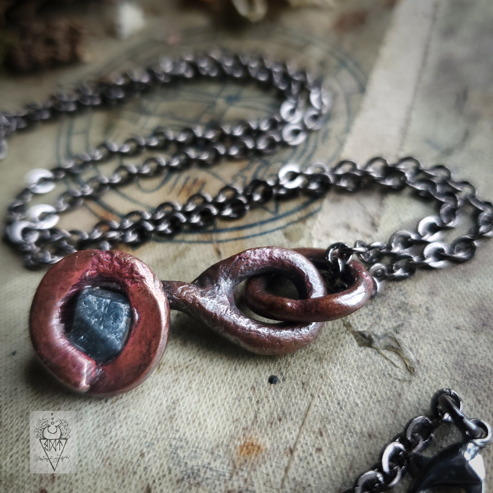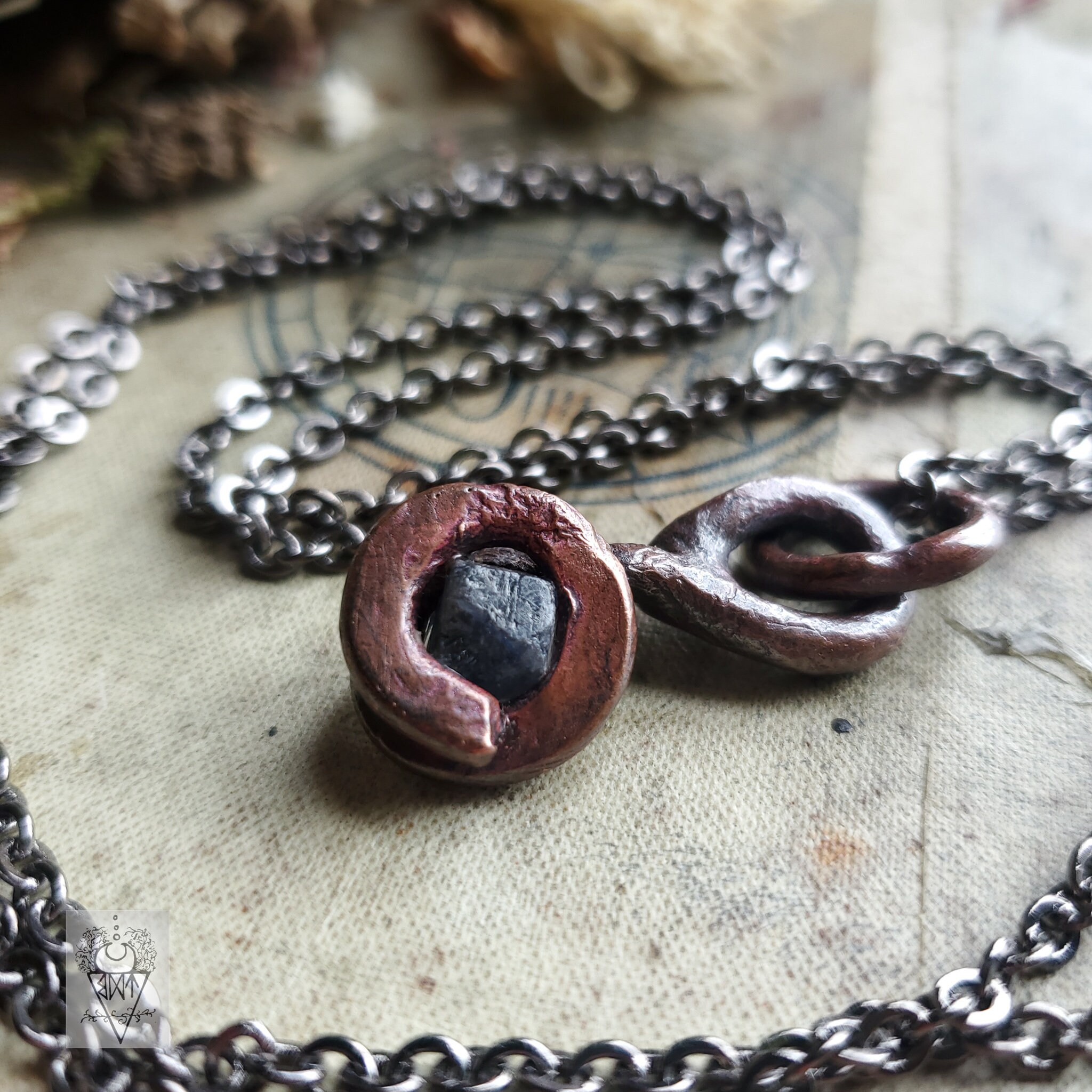 This necklace features a raw Sapphire stone set in a unique raw copper fused pendant on a gunmetal flat cable chain. This necklace measures 26 inches long with a 1.5 inch long pendant and closes easily with a lobster claw clasp.