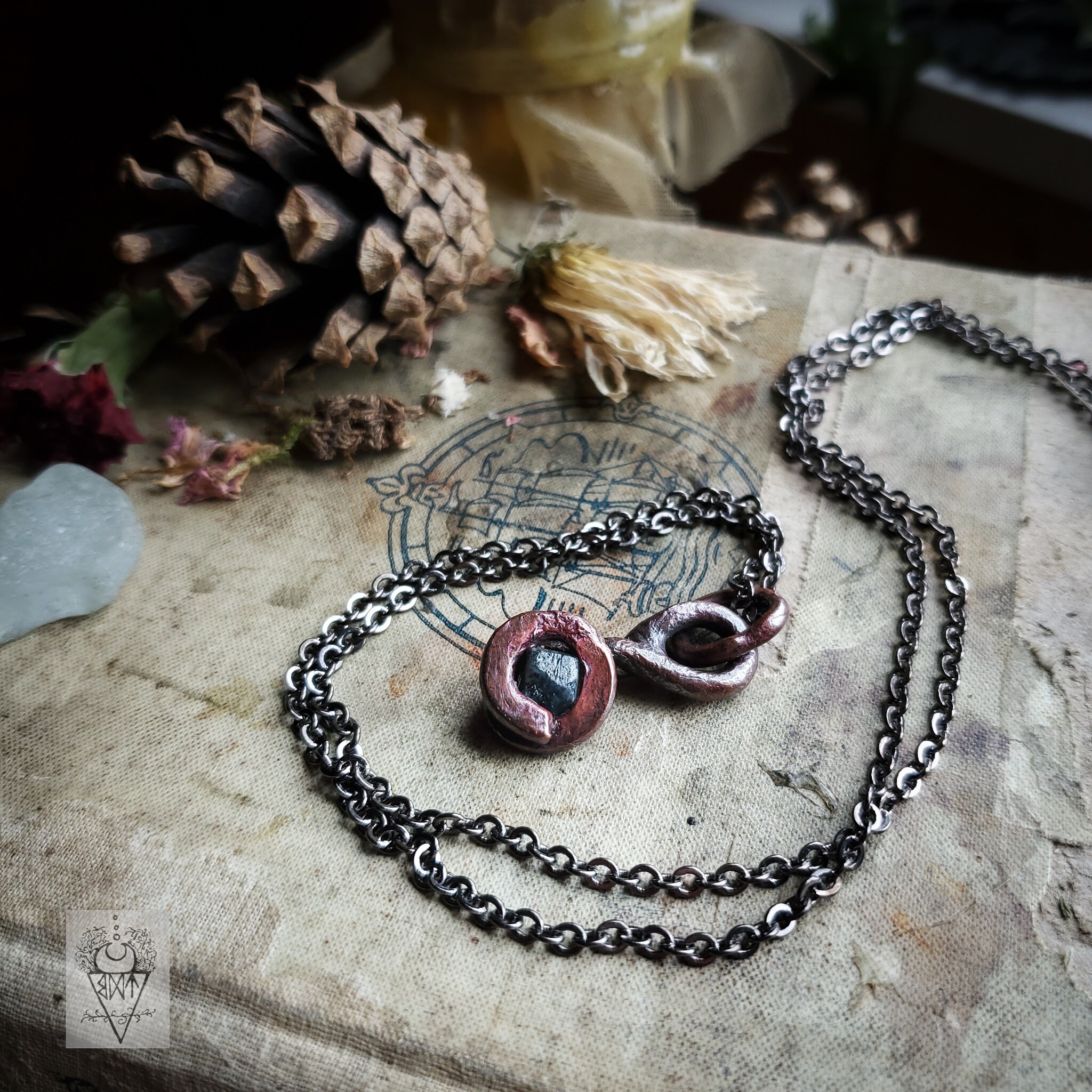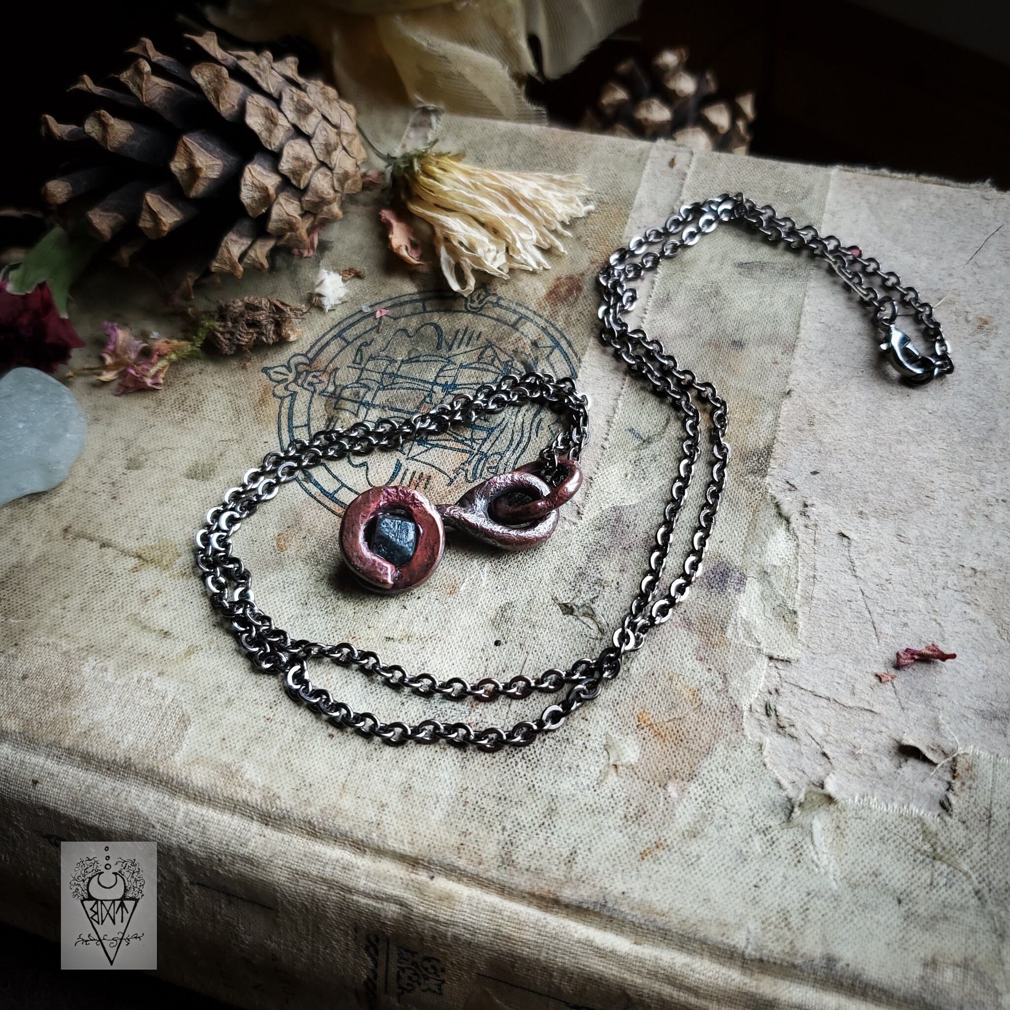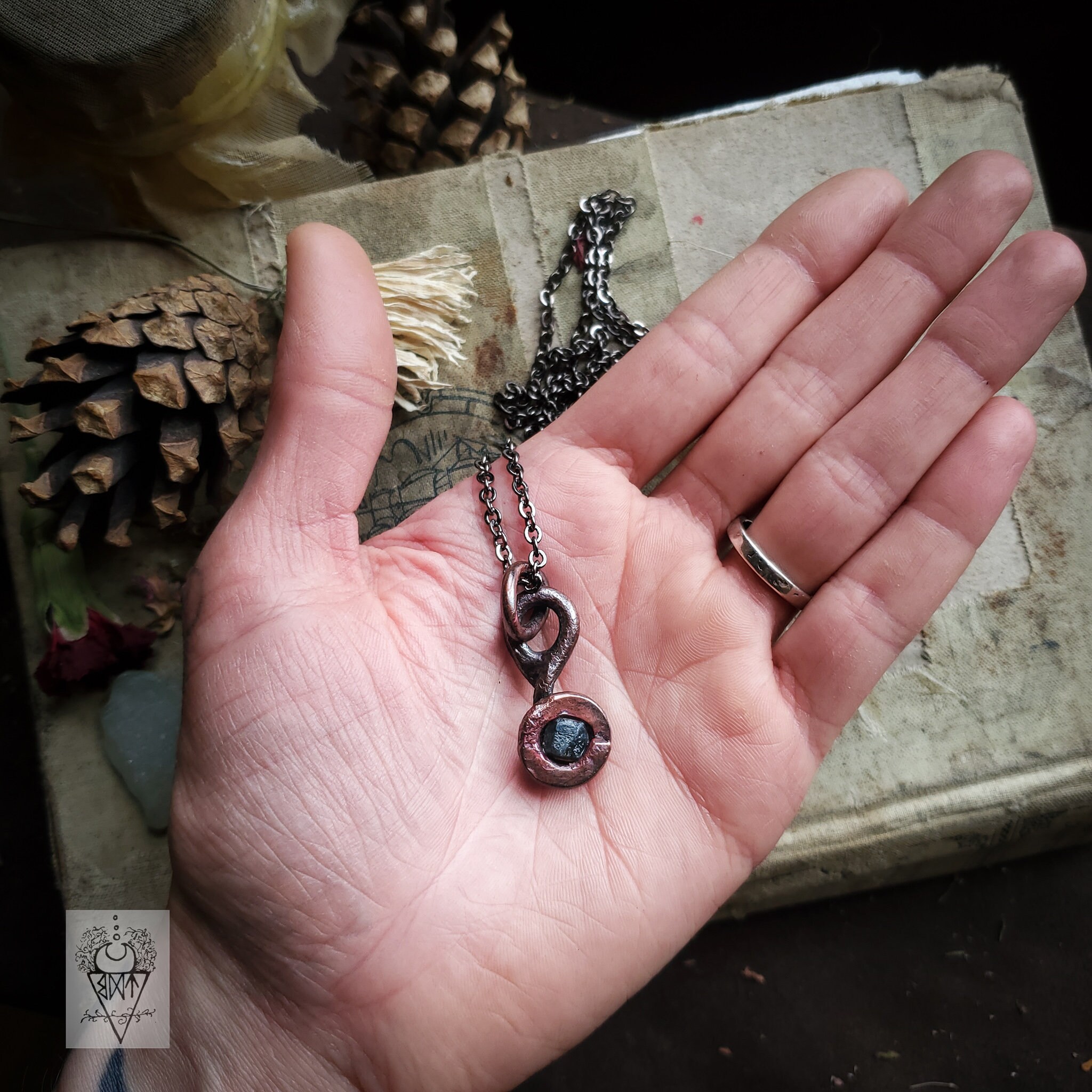 This necklace features a raw Sapphire stone set in a unique raw copper fused pendant on a gunmetal flat cable chain. This necklace measures 26 inches long with a 1.5 inch long pendant and closes easily with a lobster claw clasp.
