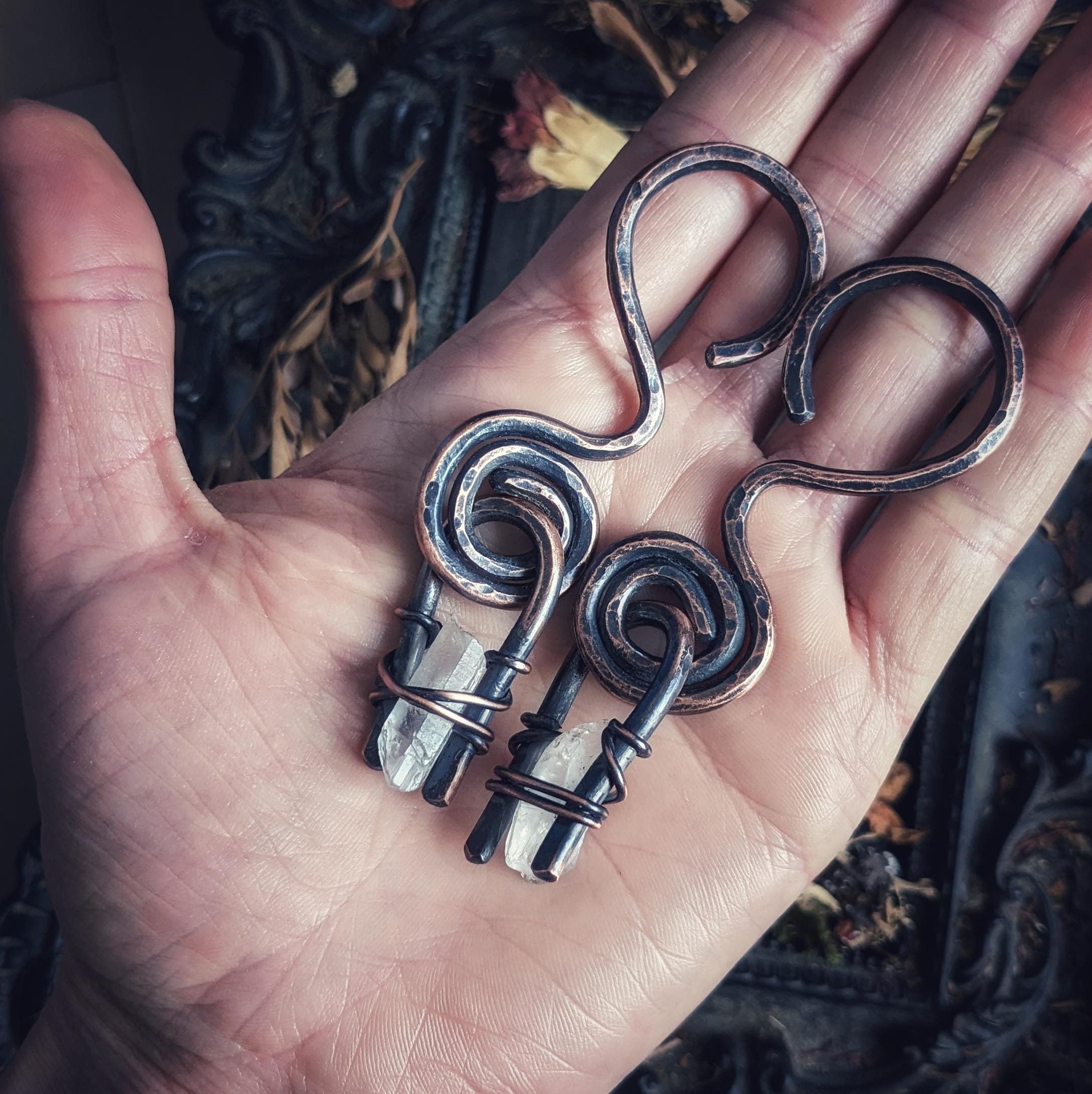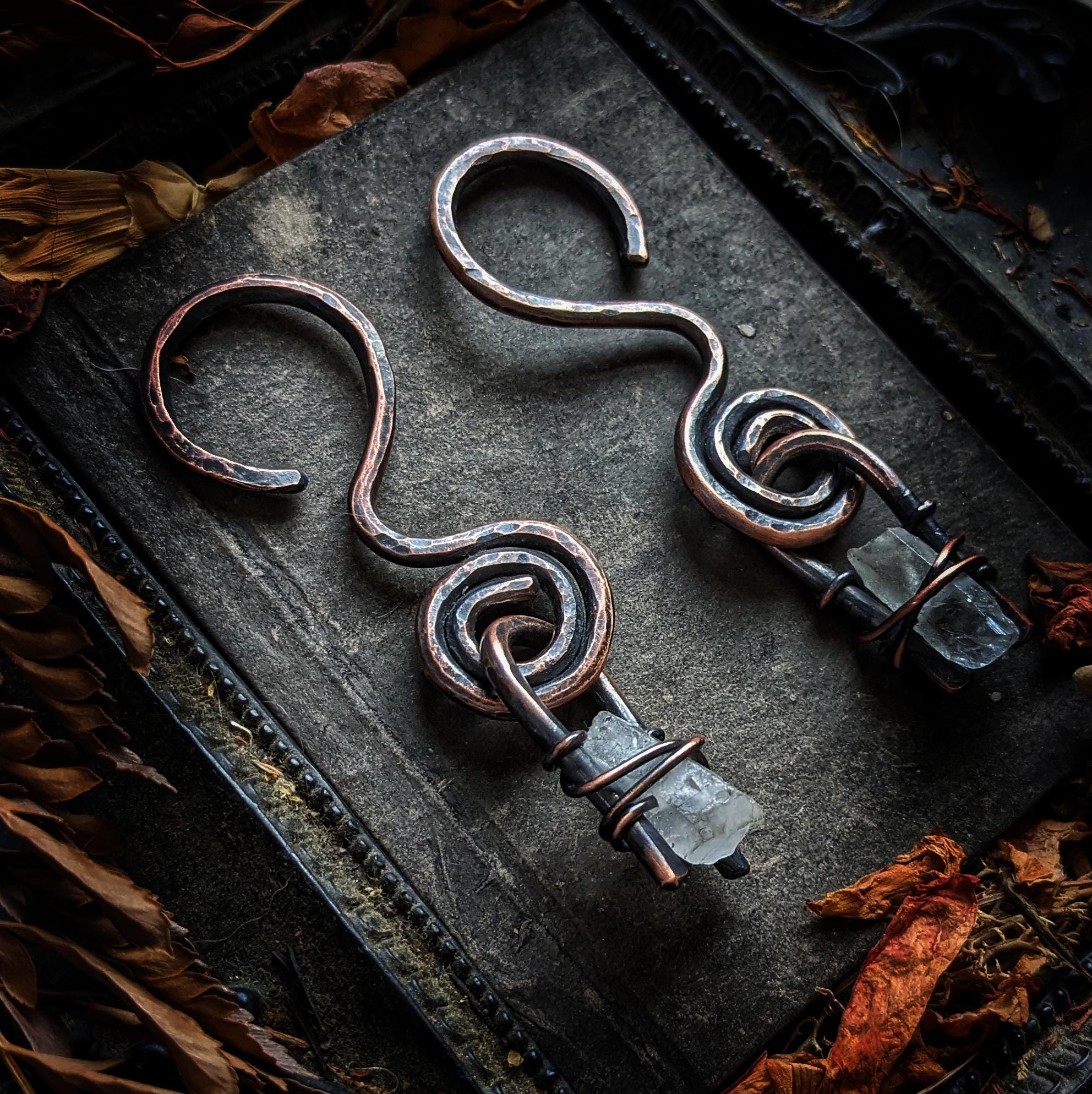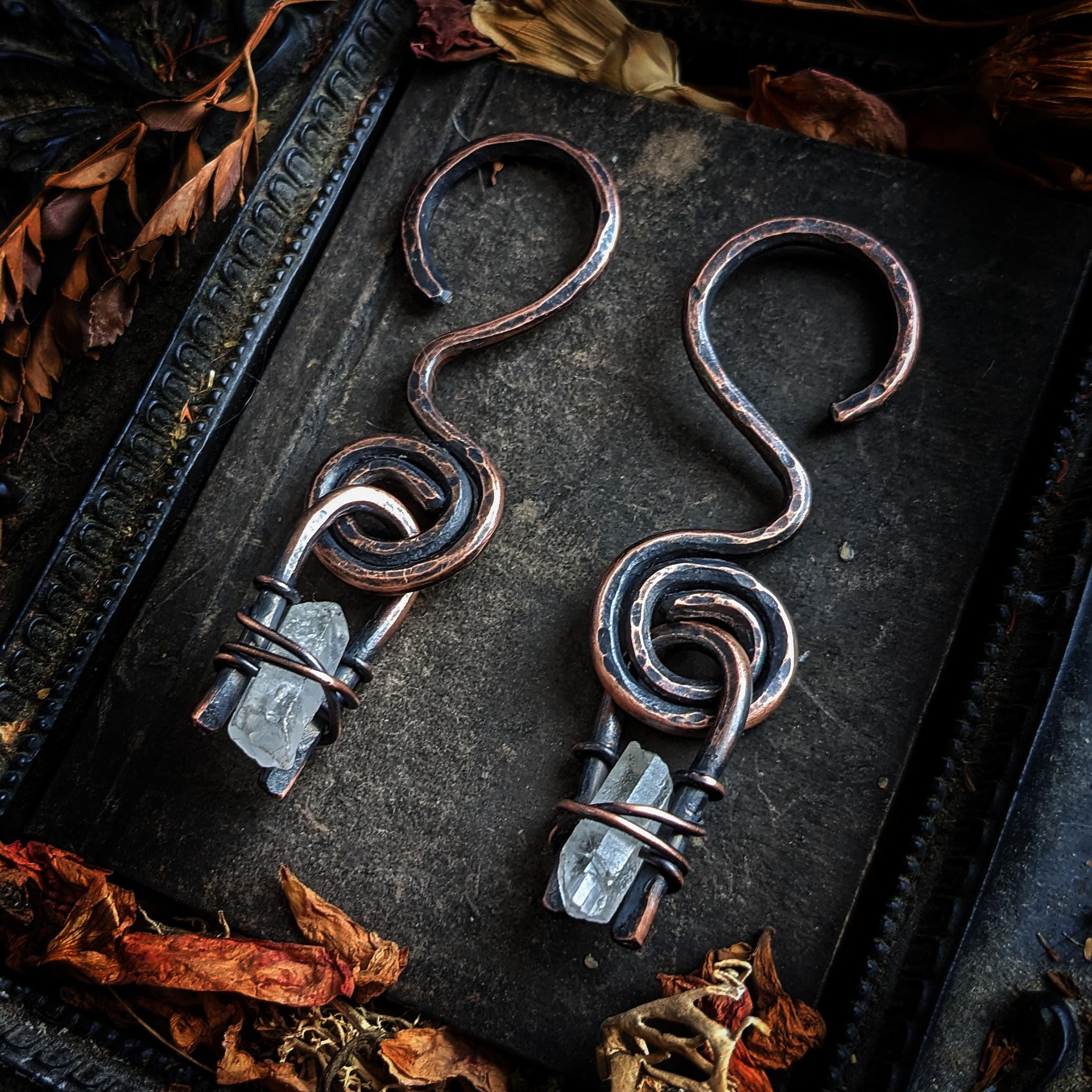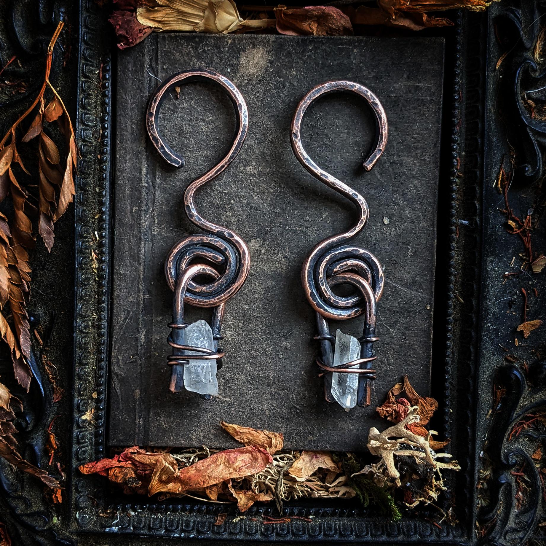 This unique design features an 8 gauge spiral hooks with a rough quartz point adorning each earring. Each earring has been given an antique patina and buffed to a shine. These earrings measure 3.5 inches long and weigh 22 grams. These earrings can be worn in tunnels or any healed ear piercing 8g or larger.