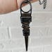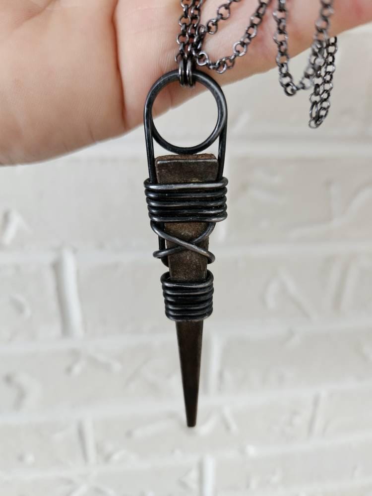 This necklace features an iron nail wrapped in iron wire on a nylon necklace. This pendant measures 10 cm long and comes on a 120 cm long and can be tied to be worn shorter or longer.