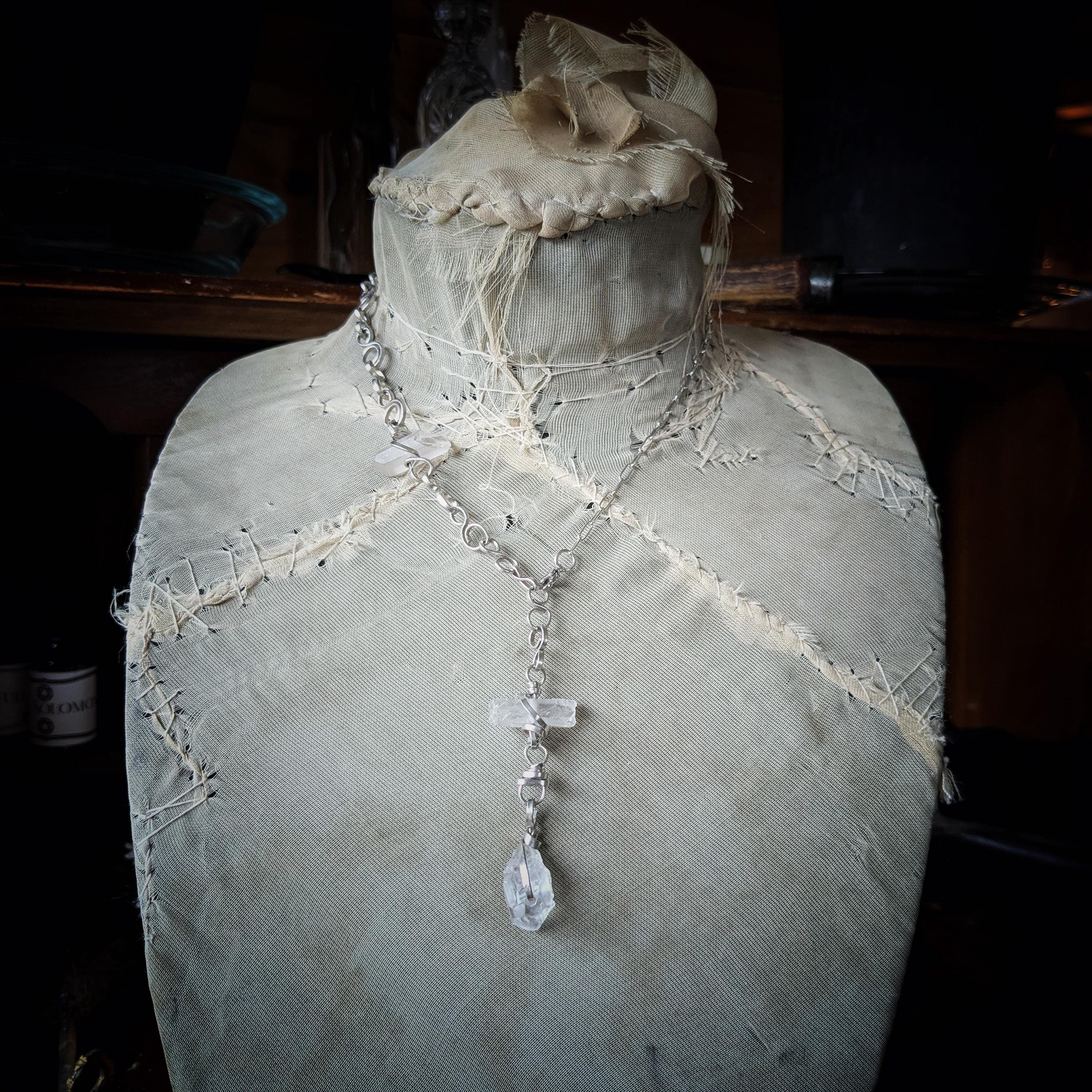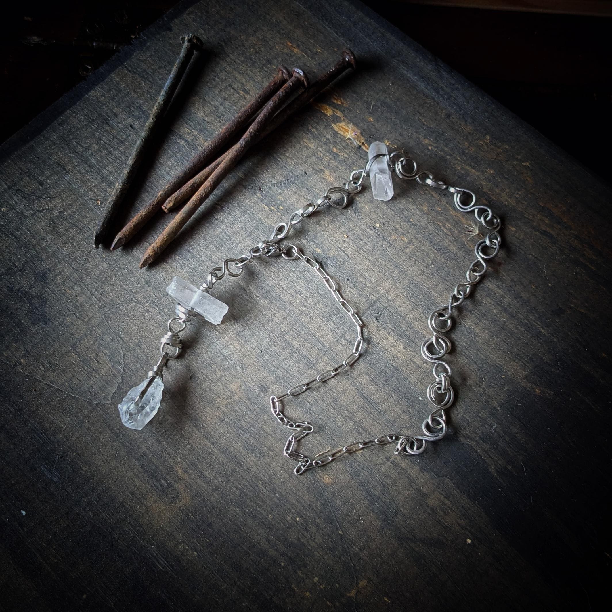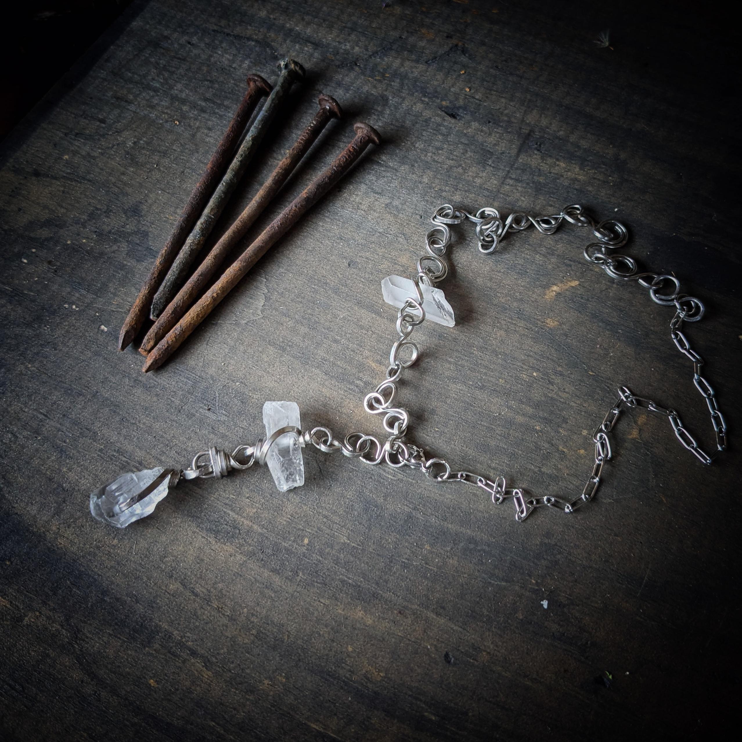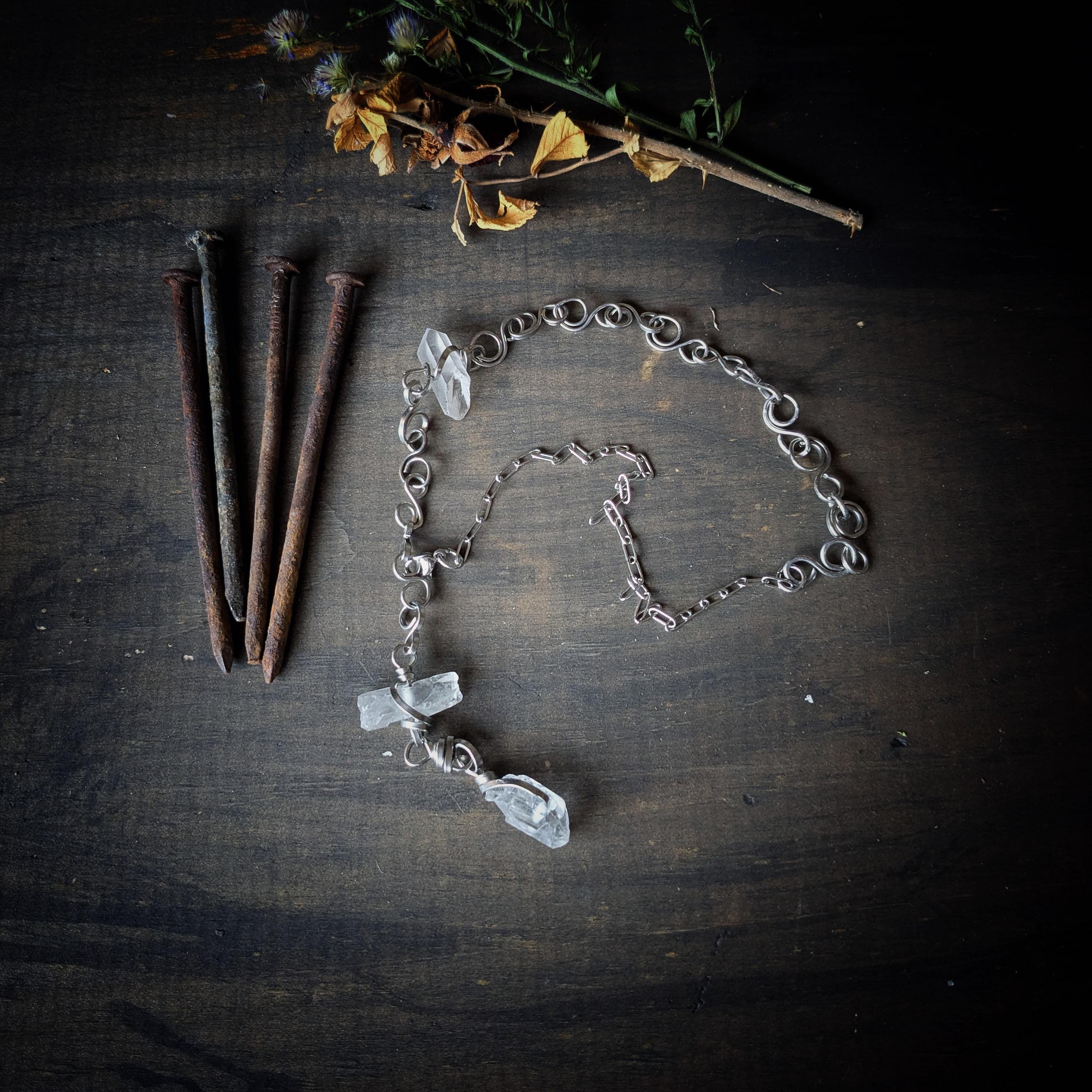 This necklace features quartz points wrapped in stainless steel on a handmade stainless steel chain that closes easily with a lobster clasp. This chain can be worn longer or shorter depening on what length you clip the lobster clasp too.