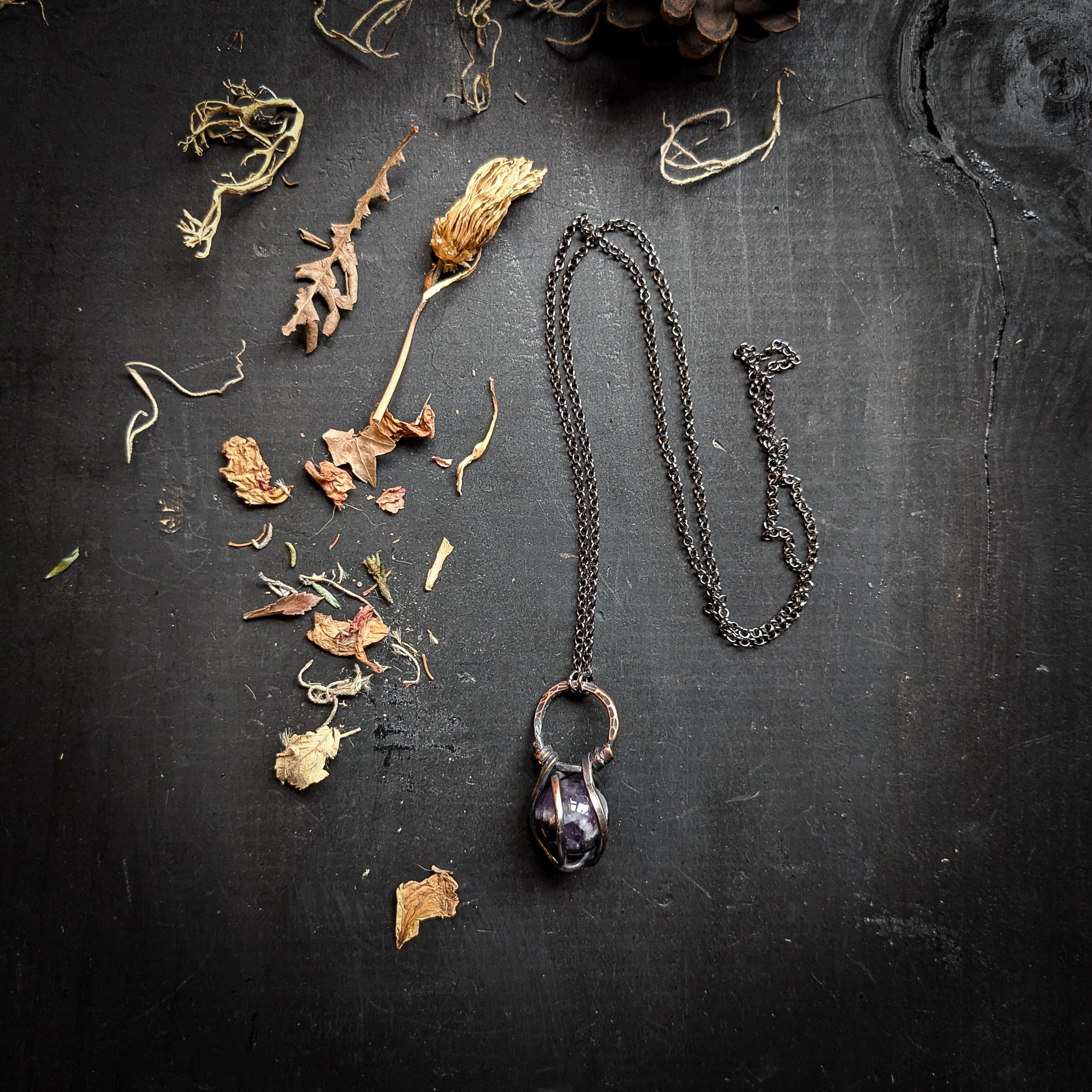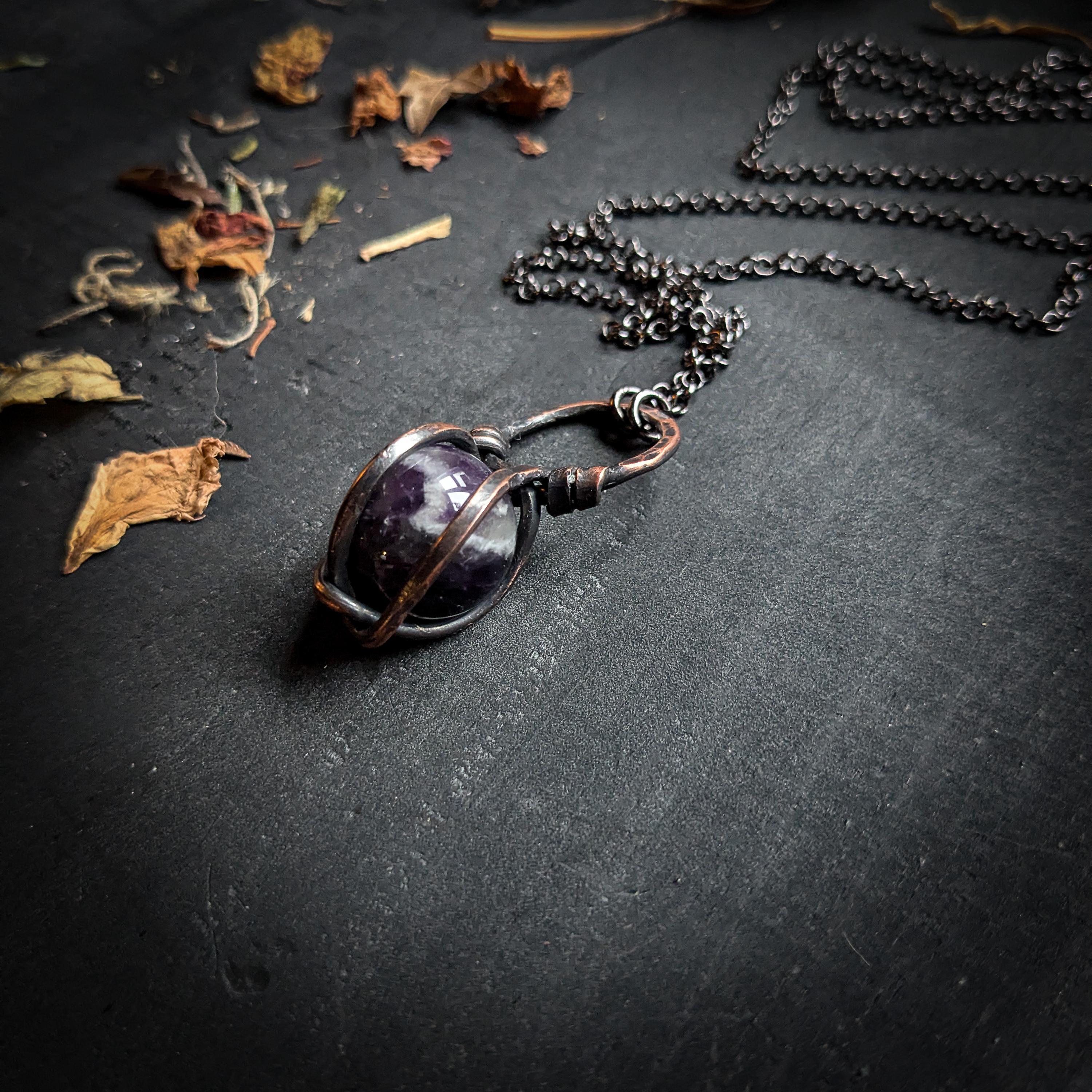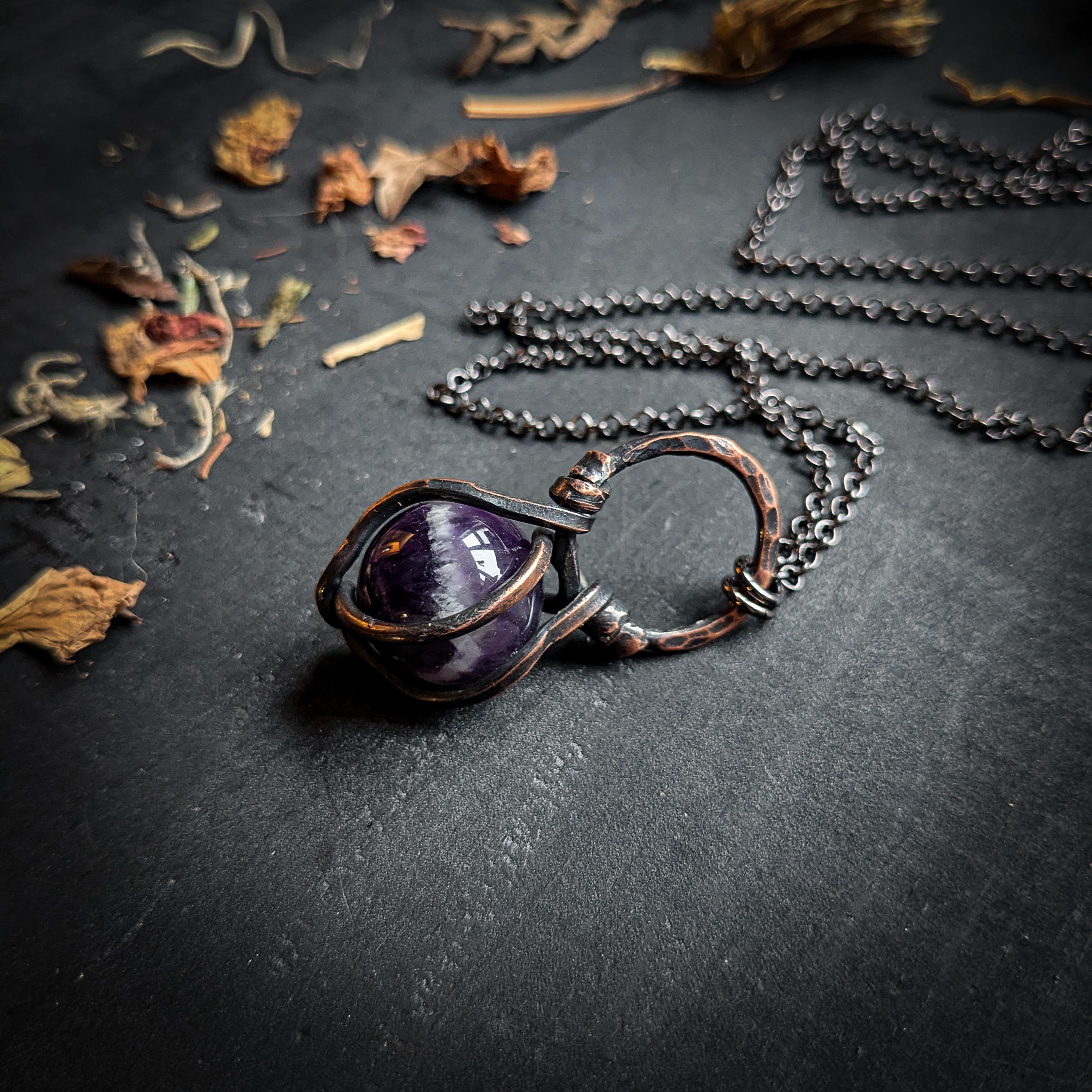 This necklace design features a chevron amethyst sphere set in a copper pendant. This pendant comes on a 68 centimeter long infinity style gun metal colored chain. Infinity style necklaces have no clasp, it is put on by easily slipping the chain over ones head.
